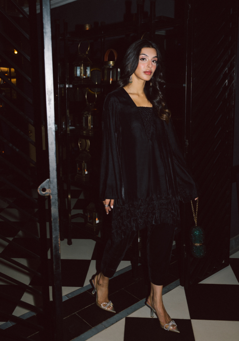 Embroidered black set Includes an embroidered shirt and bootcut pants Fabric -  Velvet   *The model...