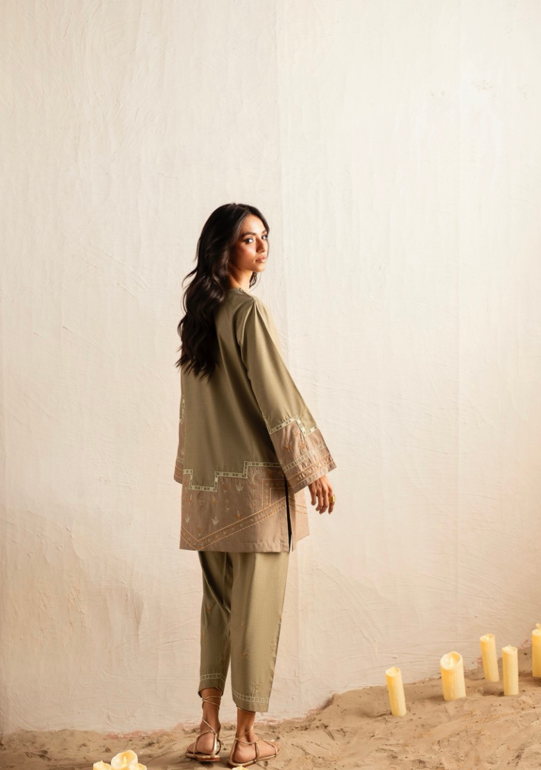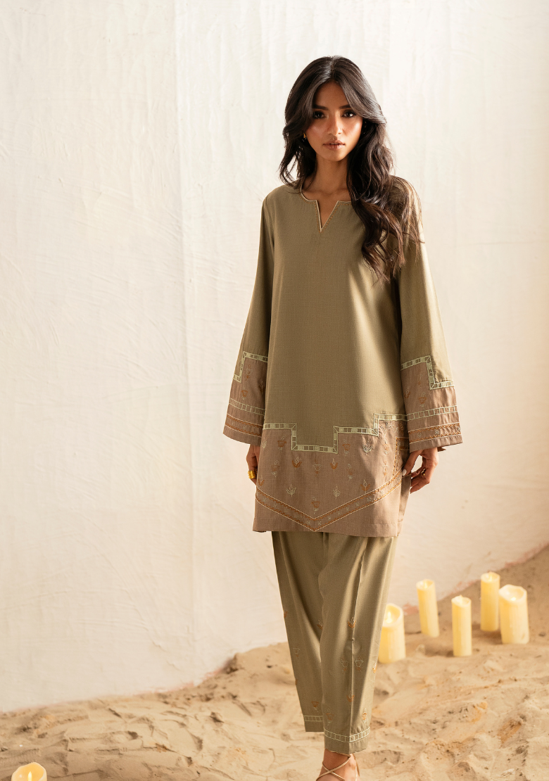 Olive & beige colour blocked set Includes an embroidered shirt and shalwar  In-house premium blended viscose Crease...