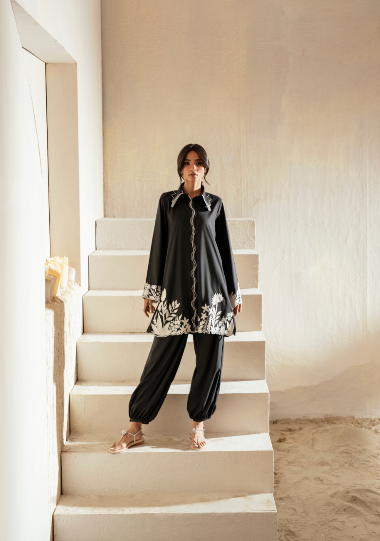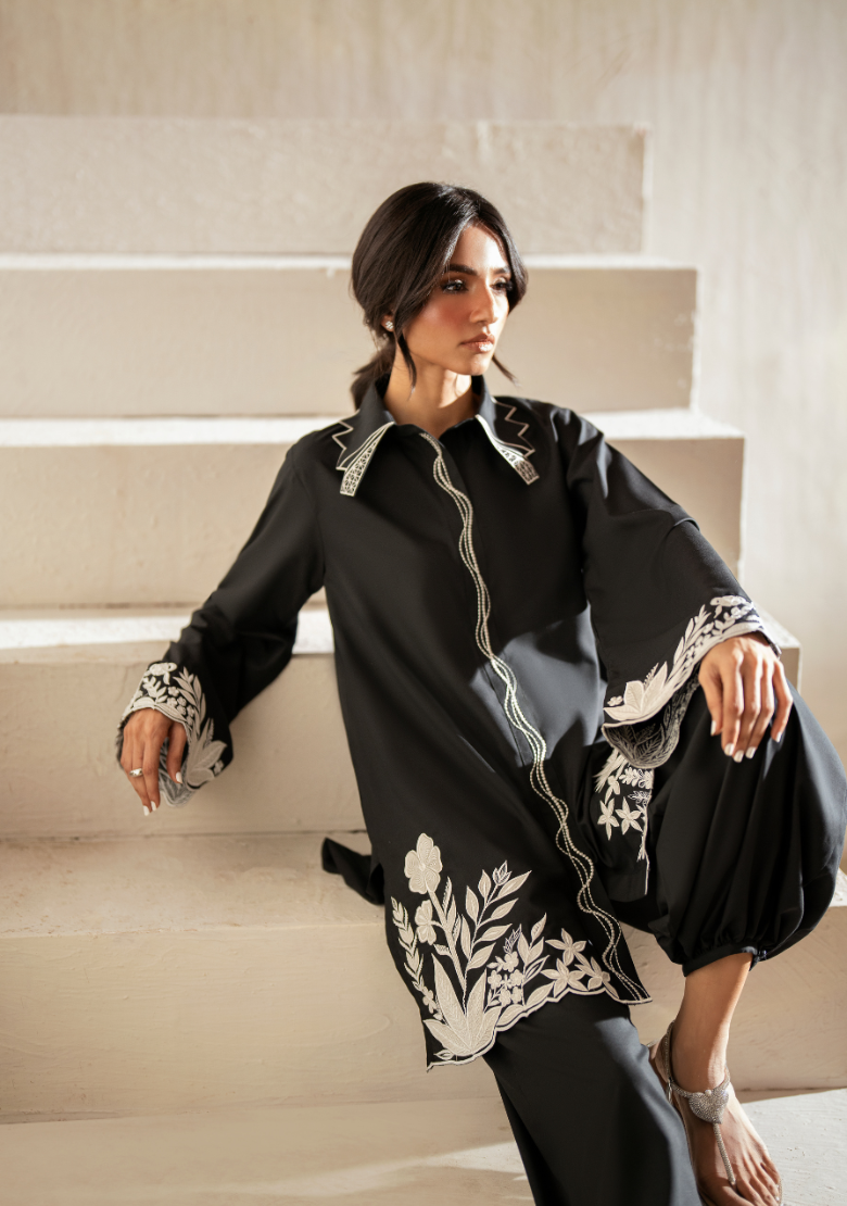 Black set Includes an embroidered shirt and balloon pants   In-house premium blended viscose Crease Resistant Suited for...