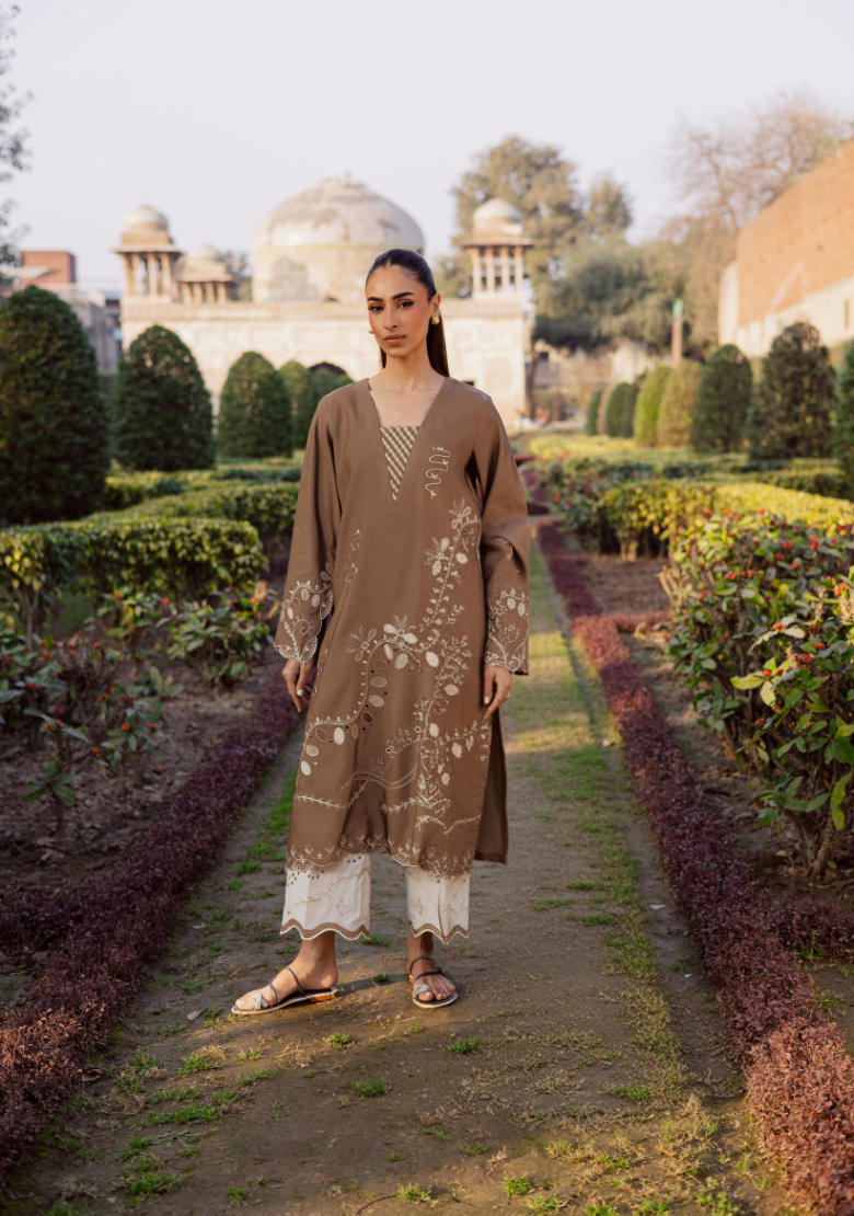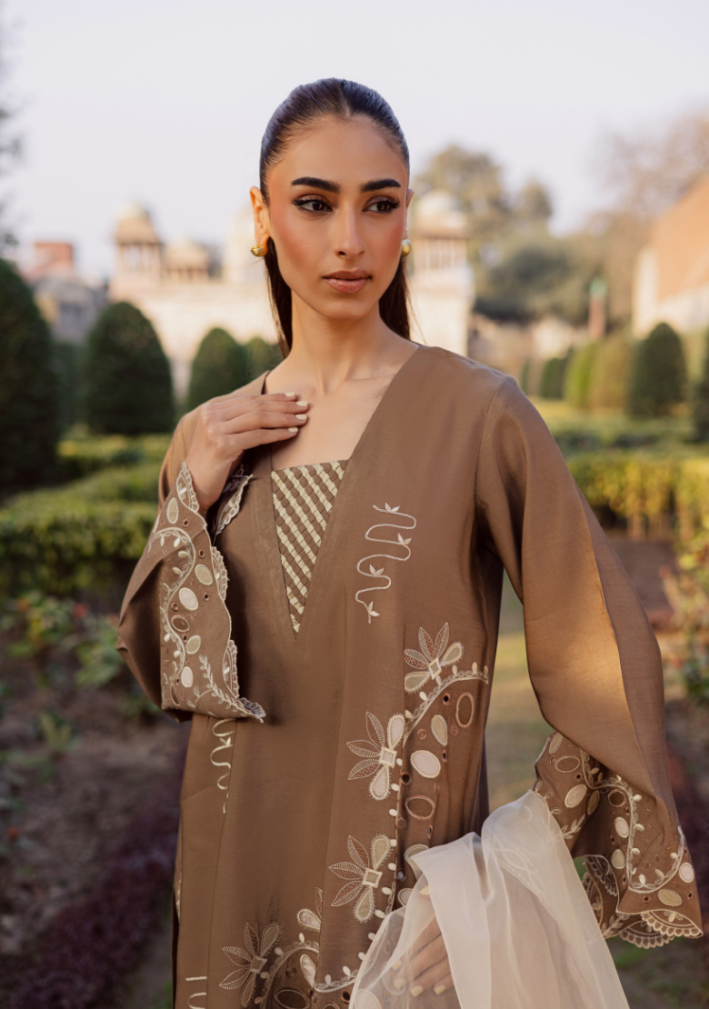Embroidered brown set Includes an embroidered shirt with cream embroidered culottes  Fabric - Khadi Silk Organza embroidered...
